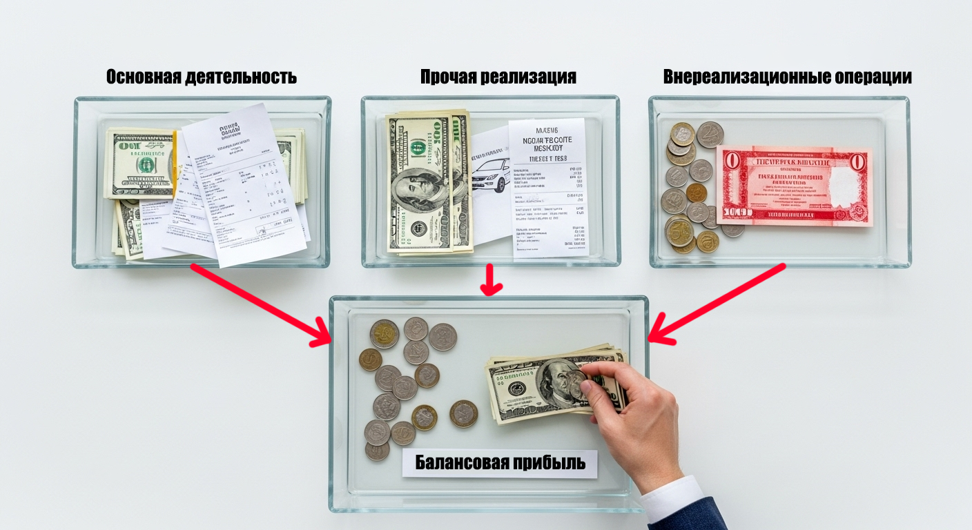 Когда компания рассчитает балансовую прибыль, она собирает данные со всех видов хозяйственной деятельности. Каждый компонент влияет на конечный результат.