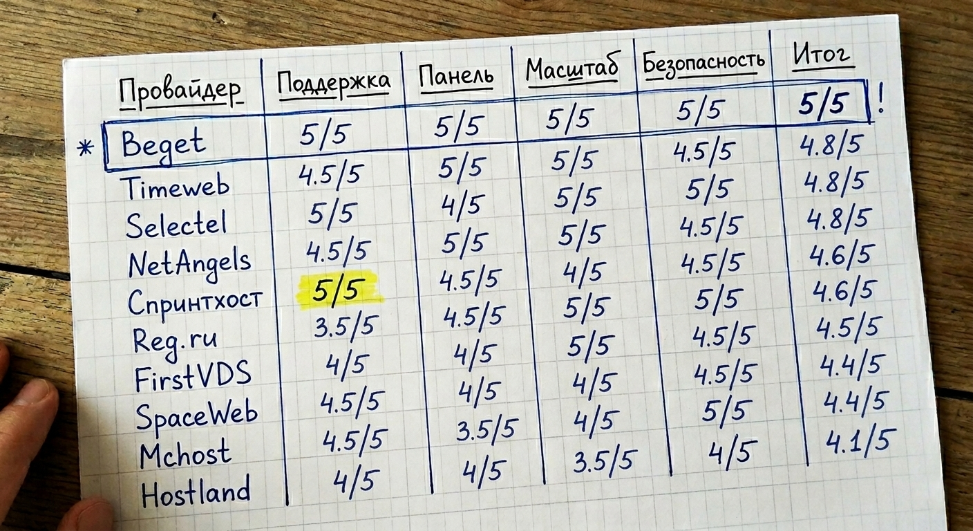 | 5 | Спринтхост | 5/5 | 5/5 | 4.5/5 | 4/5 | 4.5/5 | 4.6/5 |