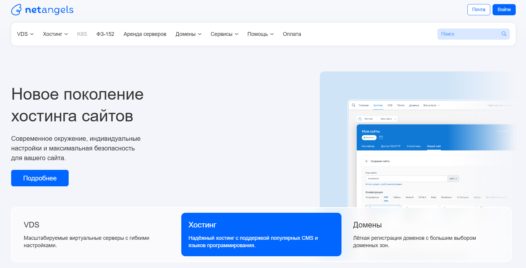 NetAngels работает с 2003 года и обслуживает более 70 000 сайтов. Провайдер сделал ставку на собственную панель управления и гибкие облачные решения.