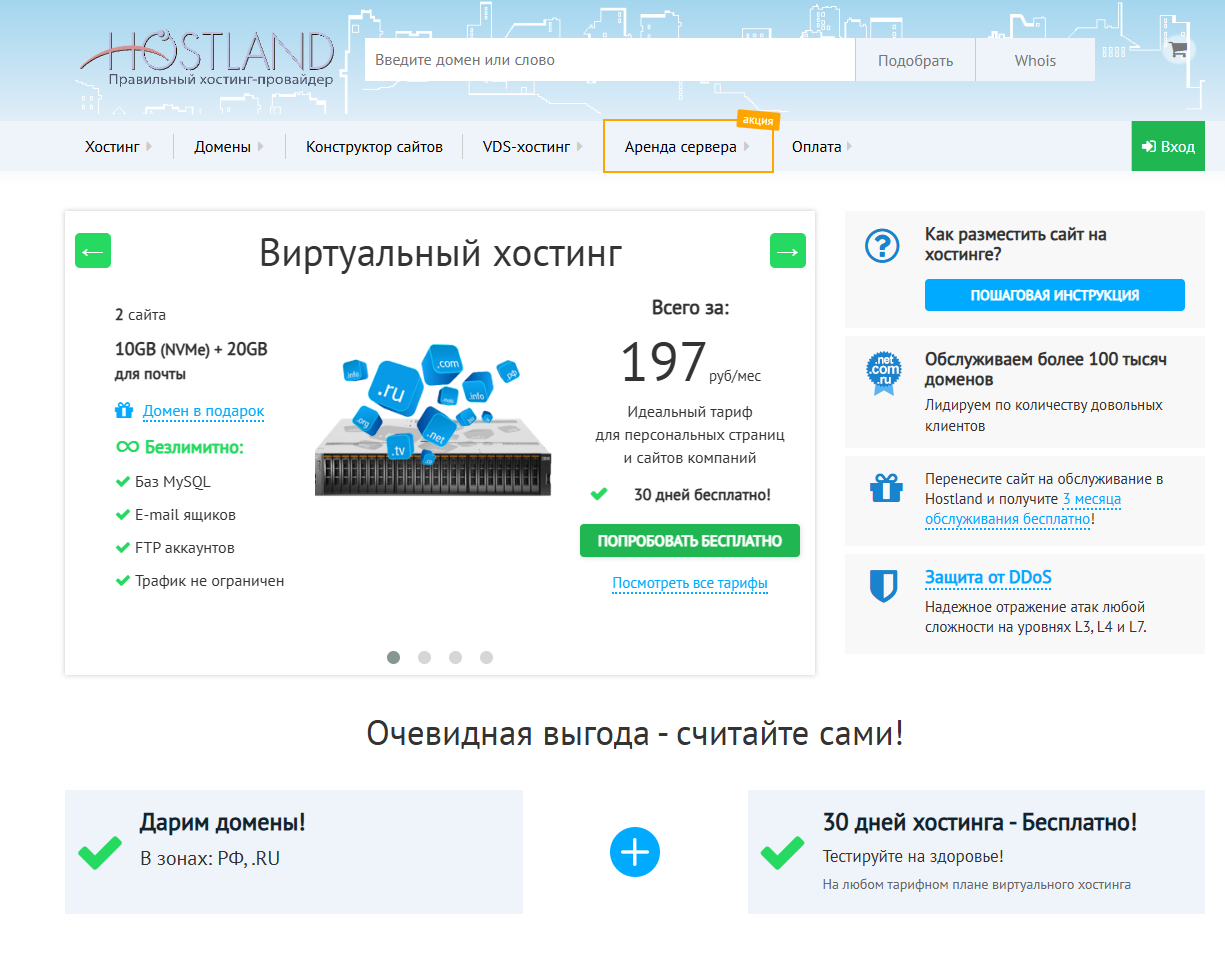 Предоставляет услуги виртуального хостинга, VPS и аренду выделенных серверов. В тарифах - установка популярных CMS в один клик прямо из панели управления.