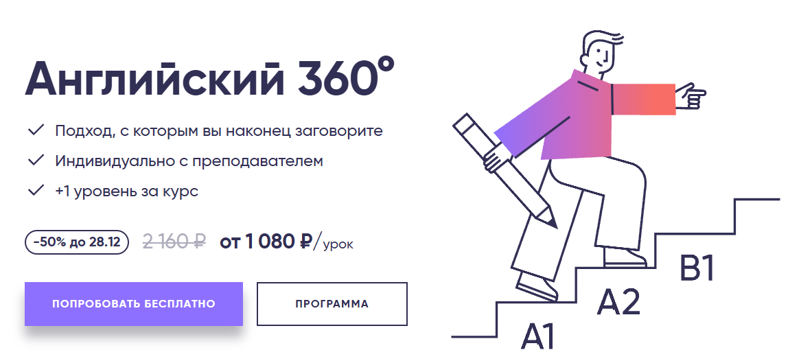 Флагманский курс школы называется "Английский 360". Эта школа английского языка гарантирует переход на новый уровень владения языком. Эта гарантия прописана в договоре.