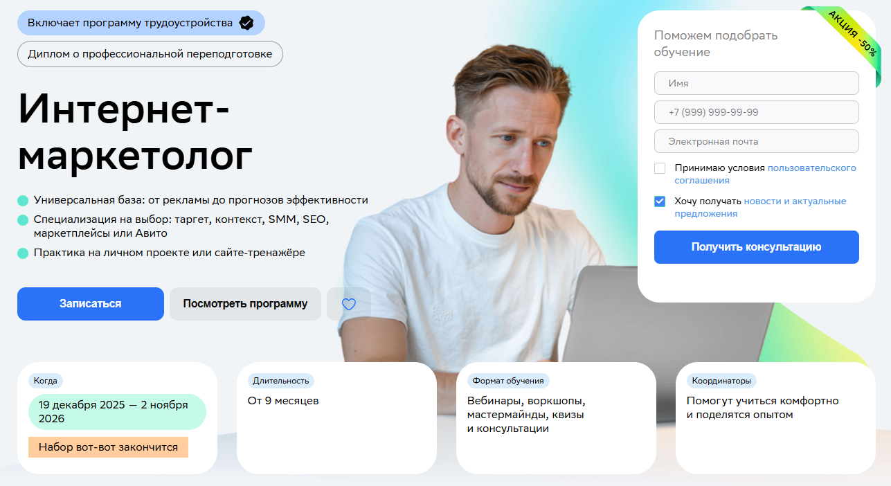Программа для быстрого освоения профессии интернет-маркетолога за 6 месяцев. Курсы охватывают все ключевые инструменты маркетинга. От SEO до таргетированной рекламы в социальных сетях.