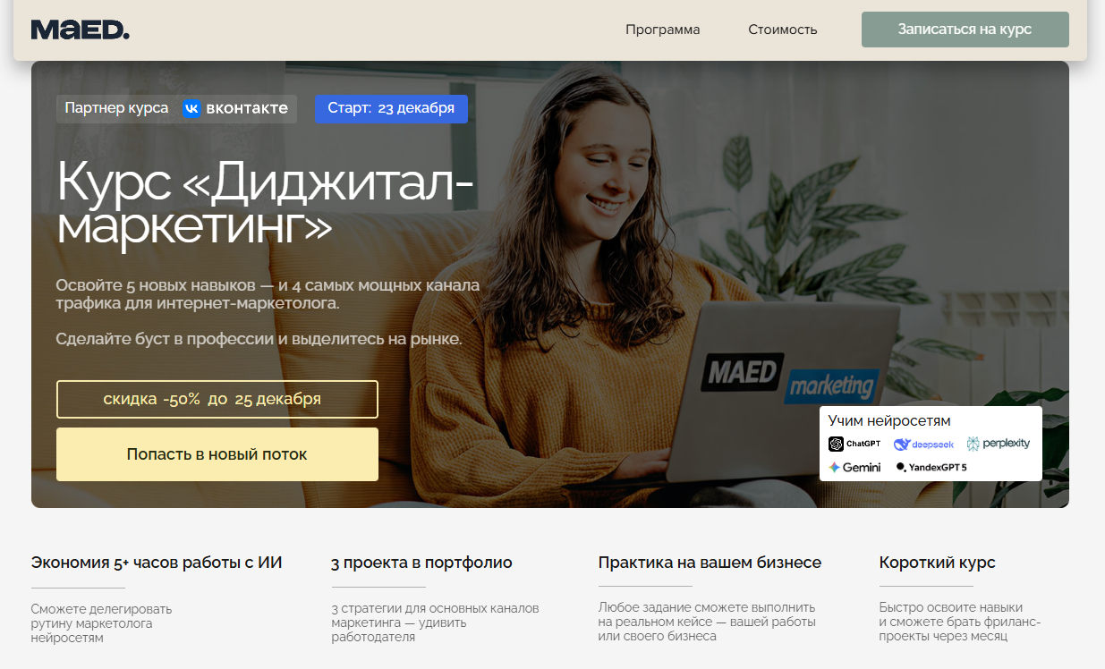 | MAED | 8.0 | 6 250 ₽/мес | 3-8 мес | Стратегия и В2В-маркетинг | Работа в B2B-сегменте |