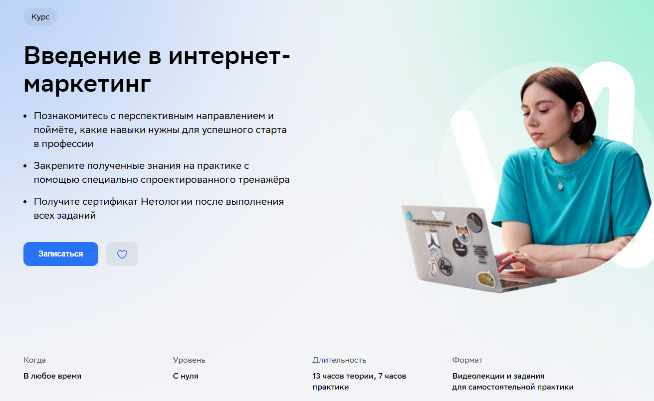 Вводный курс из 3 занятий. Разбираете основные каналы продвижения и инструменты. Узнаете, чем занимается интернет-маркетолог и какие навыки нужны.