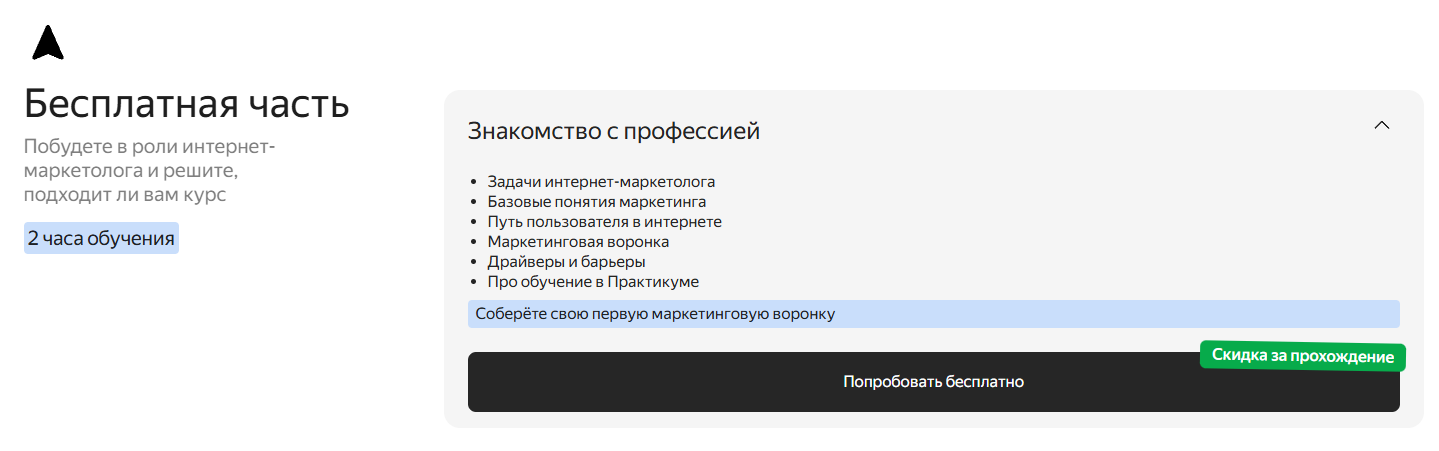 Бесплатная вводная часть основного курса. Проходите первые уроки и работаете в тренажере. Это дает понимание формата обучения на платформе.
