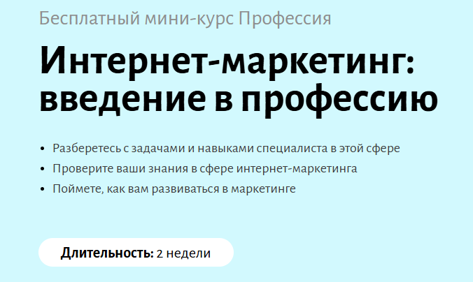 7 бесплатных уроков по базе. Краткий обзор всех инструментов маркетинга. Хорошая точка входа для желающих освоить профессию.