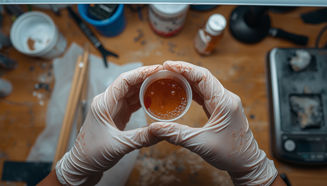 Шаг 2. Организуйте рабочее место. Безопасность в работе с эпоксидной смолой начинается с правильной экипировки. При полимеризации смола выделяет летучие органические вещества - нужен респиратор с угольными фильтрами класса A/A2, а не строительный "лепесток". Вытяжка должна выводить воздух на улицу, а не в соседнюю комнату.