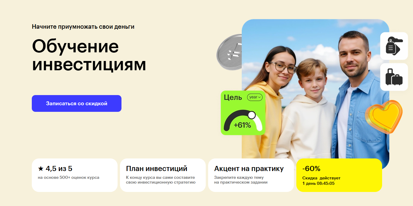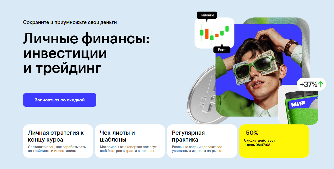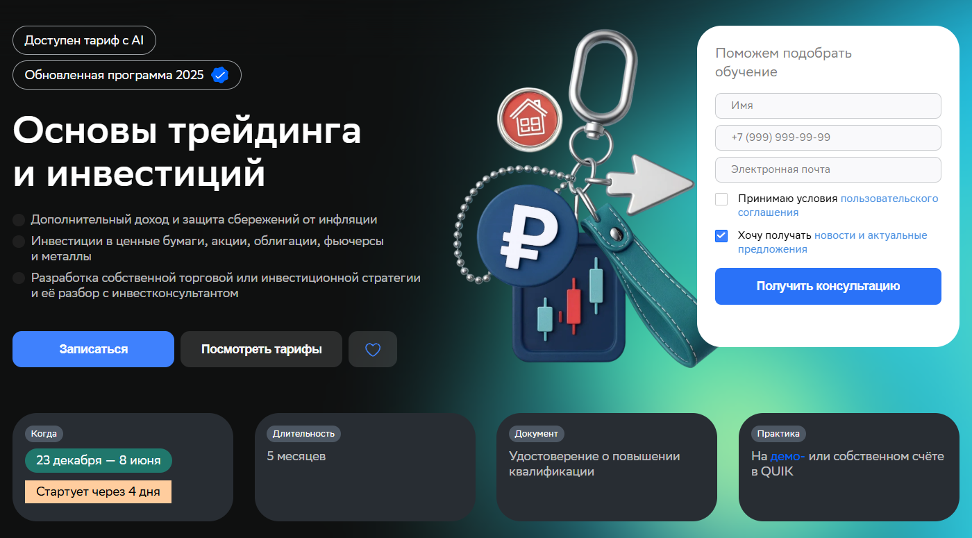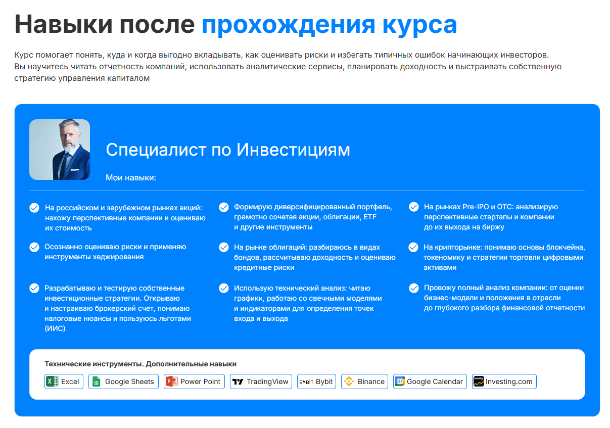 Комплексный курс, который объединяет инвестирование и трейдинг. Программа учит не только вкладывать деньги на долгий срок, но и активно торговать.