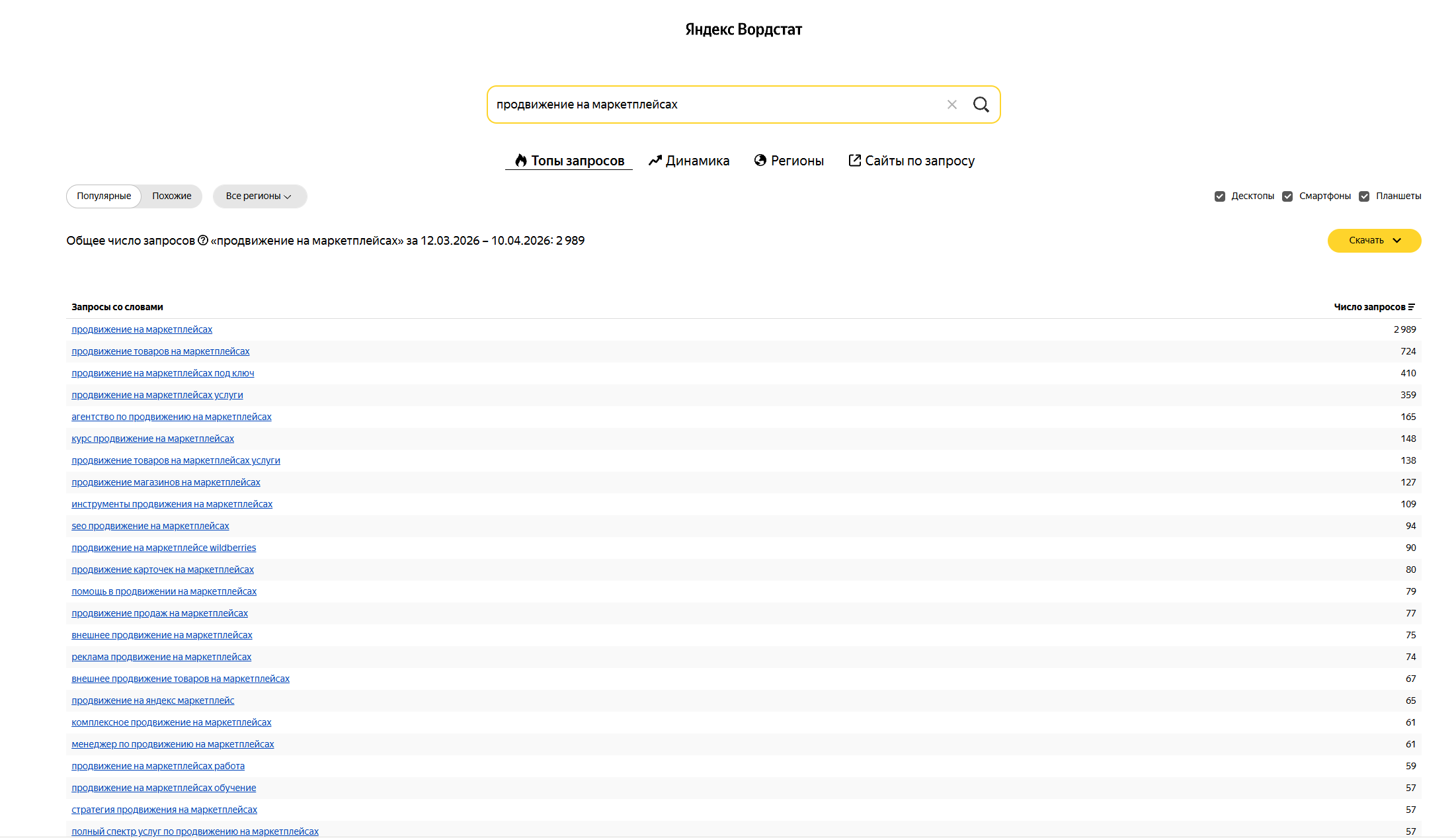 В Яндекс Вордстате это делается так: введите название товара в строку поиска, выберите регион - и сервис покажет, сколько раз в месяц пользователи ищут этот запрос. В левой колонке - прямые запросы, в правой - похожие. Из правой колонки часто находят неочевидные ключи с низкой конкуренцией. Все подходящие фразы копируйте в таблицу - это и есть основа семантического ядра.